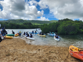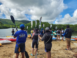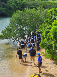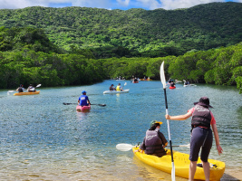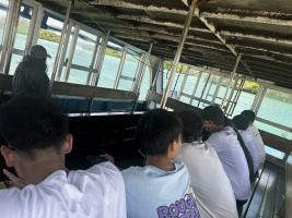 第4日目は、午前中吹通川で、マングローブカヌー体験を行いました。玉取崎で集合写真を撮影し、昼食の後、午後からは川平湾のグラスボート、唐人墓を見学したのち、ホテルに戻りました。