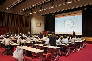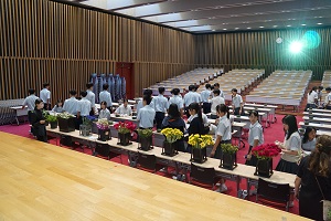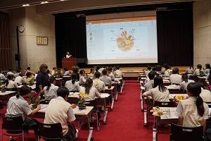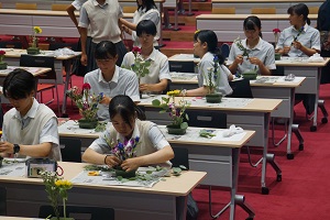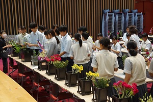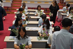 9月17日(火)の13時25分から、記念ホールで「花育」を実施しました。花育(はないく)とは、「花や緑に親しみ、育てる機会をとおして、やさしさや美しさを感じる気持ちを育むこと」です。「花セラピスト」の森島和美様を講師として、お招きしました。森島様は、農林水産省推進事業・花育講師として、多くの学校で、花育・花セラピーを実施されています。希望の生徒さんと女子野球部の生徒さんに参加してもらいました。まず、気になる花を2本選び、色・名前・理由を記入します。続いて、自由に最大8本までの花を選んで、その位置によって、その人の心理状態を、明らかにしようというものです。思い思いにいけた花は、ご家庭に持って帰っていただきました。森島様、本日は貴重な時間をありがとうございました。