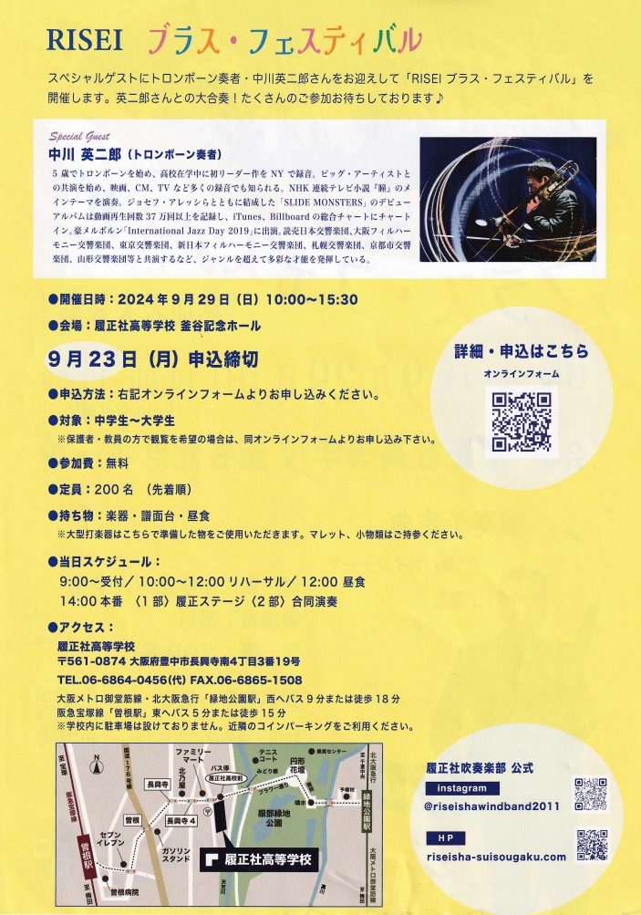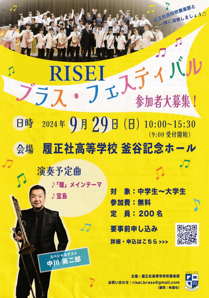 履正社高校吹奏楽部は、9月29日(日)10:00~15:30(受付9:00より)に、履正社高等学校釜谷記念ホールで、「RISEIブラス・フェスティバル」を開催します。下記QRコードより、お申込みください。多くの皆様のご参加をお待ちしております。