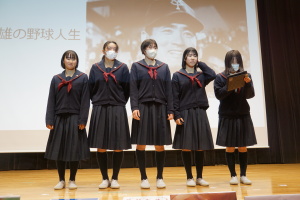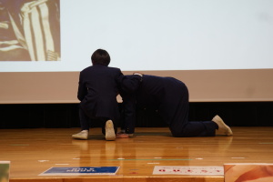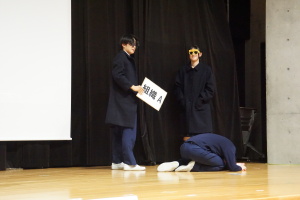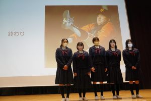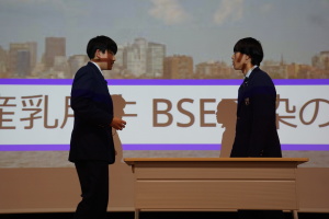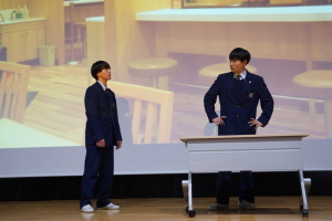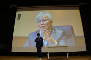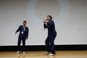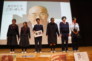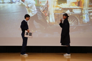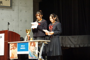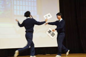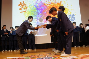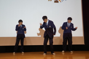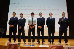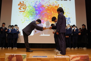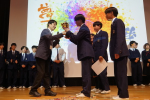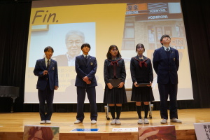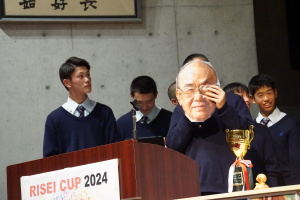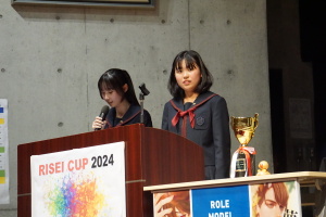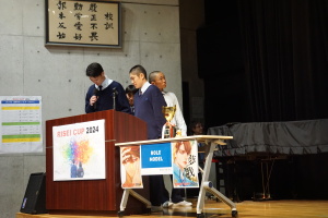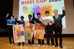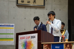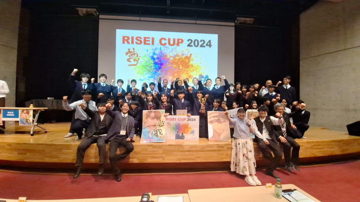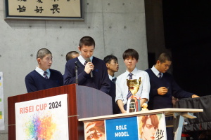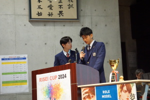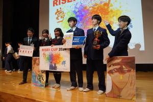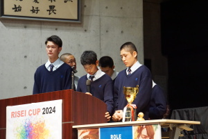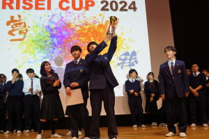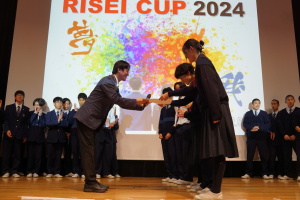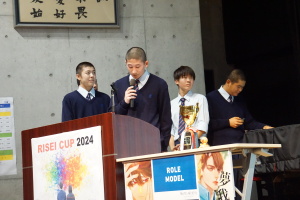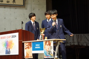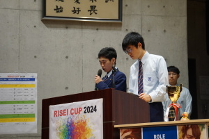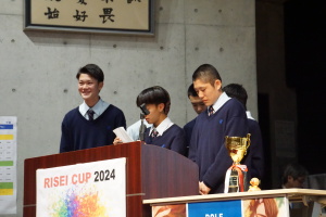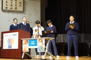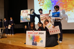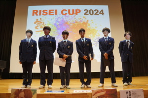 午後からは、7チームが発表を行いました。グランプリに1年6組「安部ンジャーズ」(安部修仁さん)、準グランプリに1年5組「本田翼組」(本田宗一郎さん)、第3位に1年4組「ミスター牛丼Jr」(安部修仁さん)が、それぞれ選ばれました。おめでとうございます。表彰と講評のあと、全員で記念写真を撮りました。生徒スタッフの皆さん、午前・午後とお疲れ様でした。オープニングのラップ、司会進行、開会式・閉会式の動画、ポスター、誘導、音響映像調整も、とても高いレベルで、素晴らしかったです。この後、RISEI CUPに出場しなかったチームを含め、全チームが課題研究の全国大会であるQUEST CUPにエントリーします。昨年度は、1年4組「はなえちゃんClub」(森英恵さん)が全国大会に出場し、見事に全国優勝、グランプリに輝きました。今年の1年生にも大いに期待しております。めざせ!課題研究でも、全国大会出場!そして全国優勝!なお、2年生は、12月5日(木)に開催いたします。こちらも楽しみです。