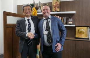 Massey High Schoolは、ニュージーランド最大都市のオークランドにあり、Year 9~Year13(日本の中学2年から高校3年)の生徒さん約1700名が在籍されている中高一貫校です。履正社とMassey High Schoolとは、ラグビーでの交流を進めており、来年4月には、部員さんを履正社にお招きして、約1週間、ホームステイや招待試合を計画しております。今日、12月10日(火)に、国際交流部の責任者であるJoshua Brodie様が、履正社に来てくださいました。食堂でランチ(日替わり定食)を食べていただいたのち、校長室で、歓迎のご挨拶をさせていただきました。その後、職員室や学術基盤センターの紹介をさせていただき、校内を案内いたしました。ご来校いただき、感謝申し上げます。今後、様々な場面での相互交流、楽しみにしております。