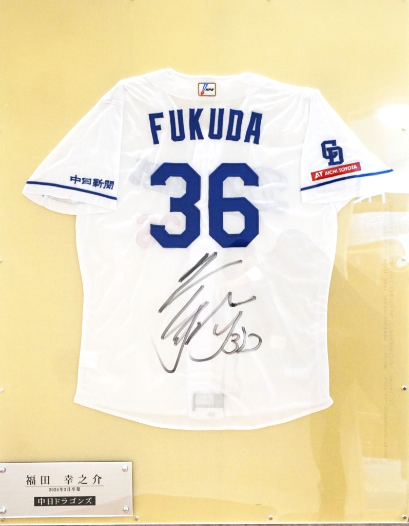 福田幸之介選手のユニフォームを展示しました(硬式野球部)
