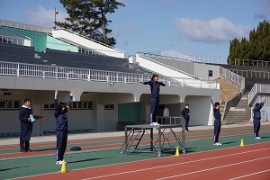 開会式終了後、学校で更衣をすませ、緑地公園陸上競技場に集合して、生徒会体育部長の号令で、準備体操を行い、高校1年、中学校・高校2年、高校女子、の順にスタートしました。緑地公園内を周回し、高校男子は2周6km、高校女子、中学校は1周3kmを走りました。