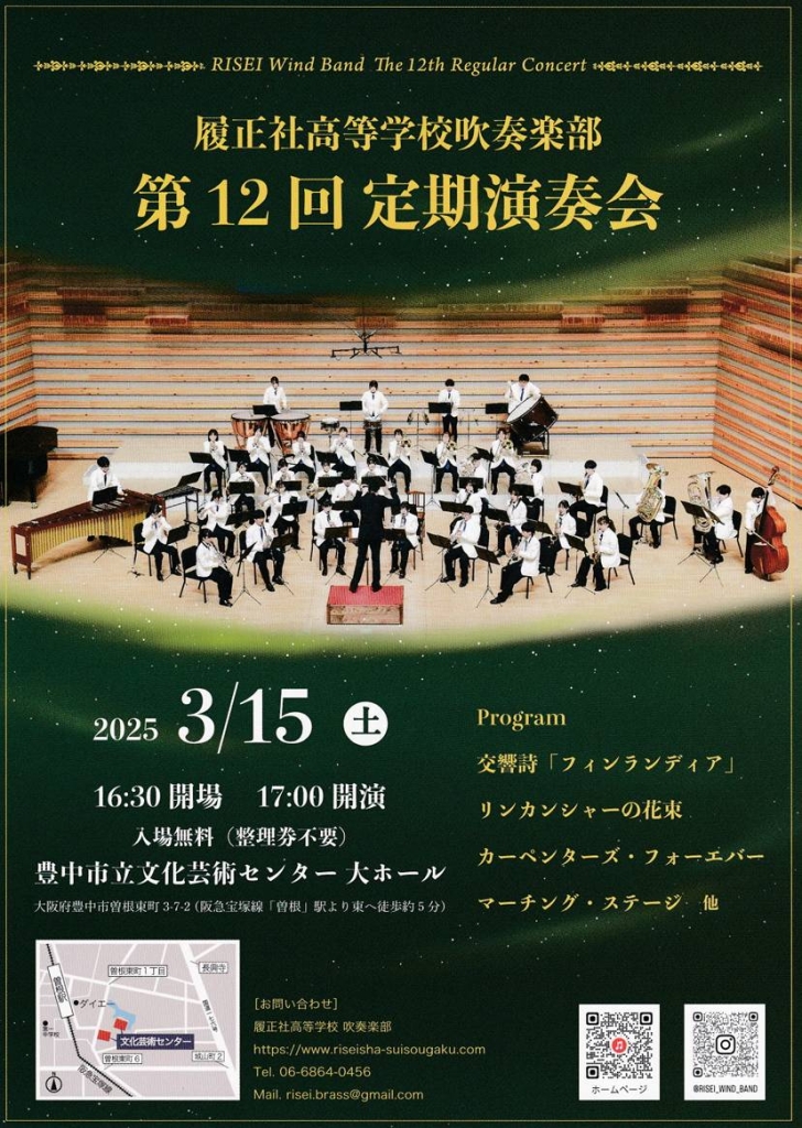 2025.02.25 校長・理事長通信 「第12回定期演奏会」を開催します(吹奏楽部) 履正社高校吹奏楽部は、3月15日(土)17時(開場16時30分)から、豊中市立文化芸術センター大ホール(阪急宝塚線曽根駅下車)で「第12回定期演奏会」を開催します。入場は、無料です。多くの皆さんのご来場をお待ちしております。