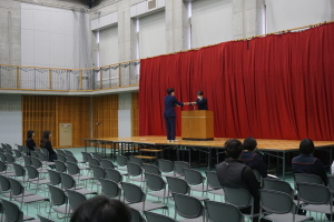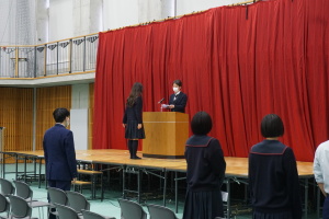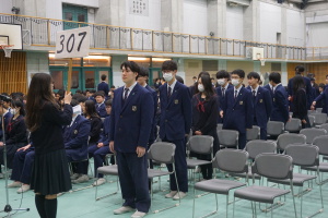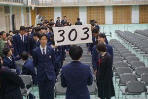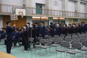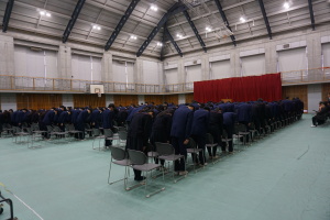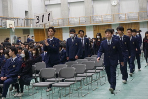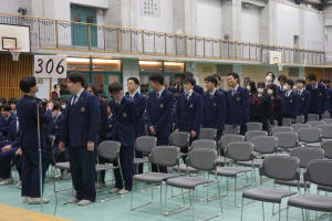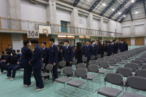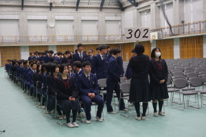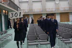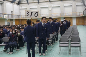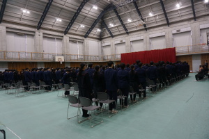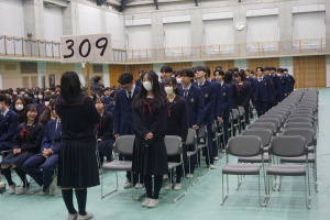 3月8日(土)は、第74回卒業式です。本日2月28日(金)の午後に総合体育館で、卒業式予行を行いました。まず代表生徒さんに集まっていただき、賞状授与の練習を行いました。13時から、クラス入場を行い、起立・礼・着席、歌の斉唱、担任の先生の呼名に大きな声での返事など、当日の式次第に従い、練習を行いました。みんなでよい卒業式にしましょう。