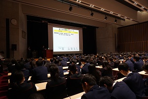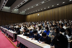 3月1日(土)11時30分から、代々木ゼミナールから講師をお迎えして、2年生の生徒さん及び保護者様を対象に、進路講演会を開催しました。テーマは、「3年生0学期からの挑戦」。1ランク上の大学を狙うために高2生がこれから取組むべき学習と大学選びのヒントとなるポイントについて、「大学入学共通テスト」を中心に、ご説明していただきました。多くの皆様に、ご来校いただきましたので、会場の記念ホールに入りきれない方は、別会場にご案内し、同じ内容をオンラインで、見ていただきました。