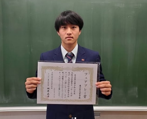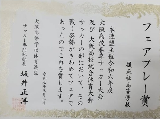 3月2日(日)に、履正社高校サッカー部は、大阪高等学校体育連盟サッカー専門部より、今年度の高体連主催大会において、戦う姿勢がきわめてフェアであったため、「フェアプレー賞」を受賞しました。おめでとうございます。これが、5度目の受賞となります。引き続き、フェアプレーを心がけて、良い試合をしてください。