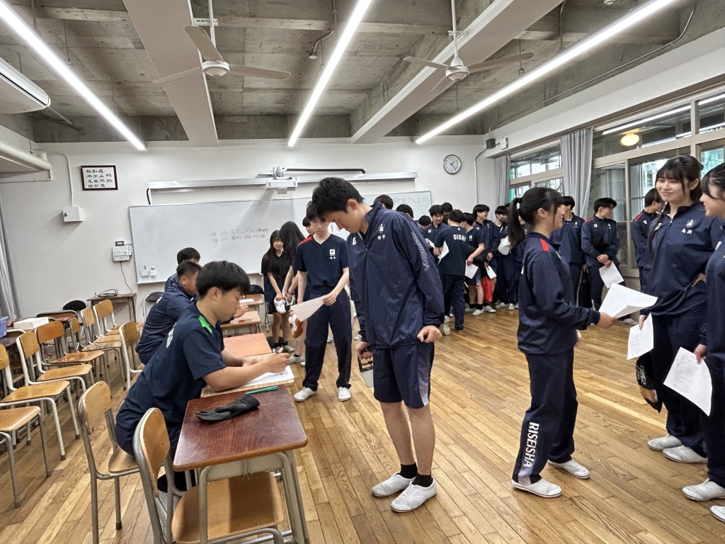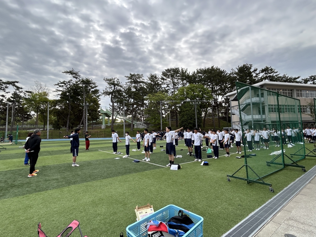 履正社高等学校のスポーツテストは教員ではなくアスリートコースの生徒たち主導で行われます。日々部活で培っているチームワークは圧巻で、その運営のスムーズさは教員も驚くほどです!ハンドボール投げのエリアではサッカー部による息の合った応援も見られ、笑顔で汗を流す生徒たちの姿がありました。