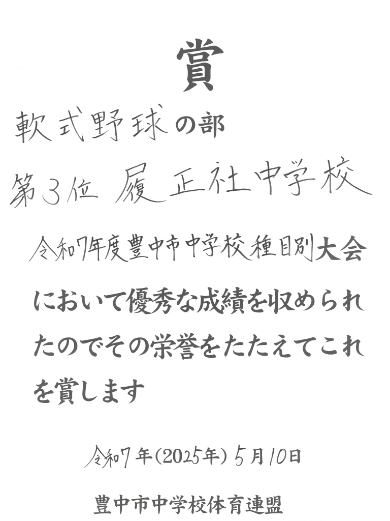 4月26日から5月11日にかけて開催された,「令和7年度春季豊中市種目別大会 軟式野球の部」に本校の軟式野球部が出場し,第3位となりました。
