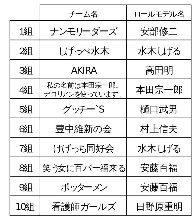 各グループでモデルとなる先人(右表)を選び、1学期から半年かけてその人物を探究し、クラス内のプレゼン(予選)で1位となったチームが代表としてこの本選 “RISEI CUP” に進んだわけです。