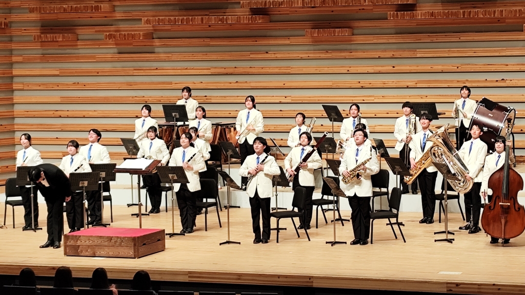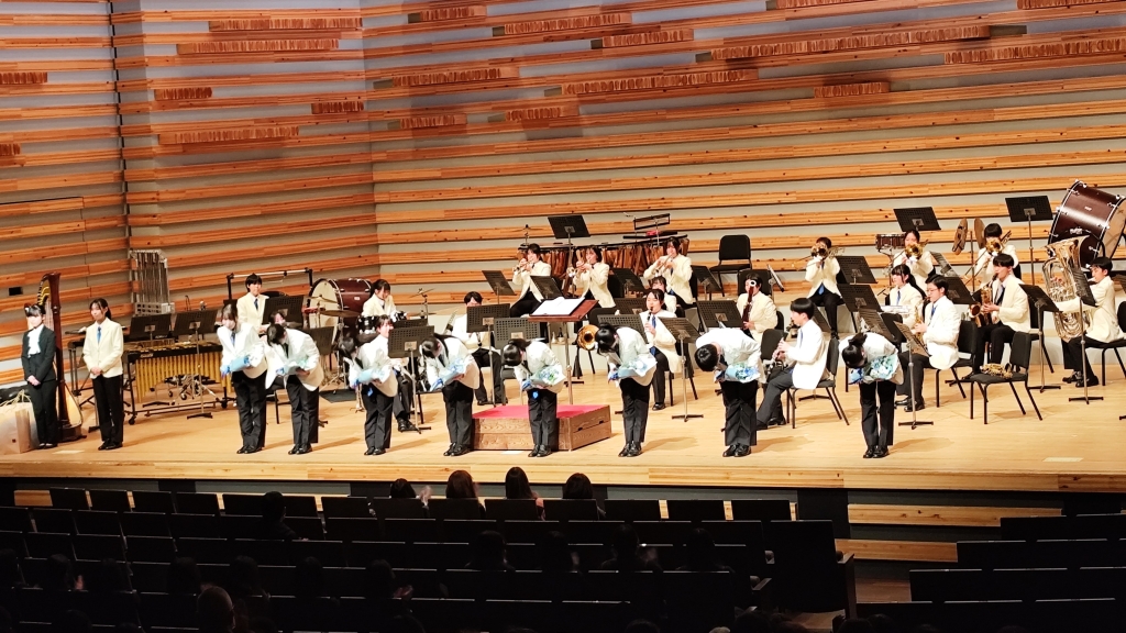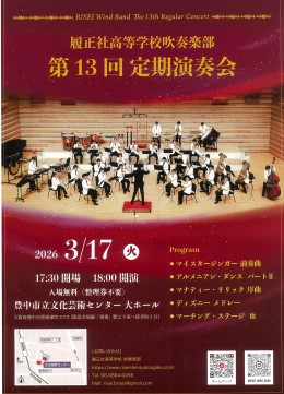 去る3/17(火)に豊中市立文化芸術センター大ホールで、本校吹奏楽部の第13回定期演奏会が開かれました。本校の生徒や保護者、教職員、部員たちのご家族知人友人の方々、一般の愛好家の皆様などで、1Fホールがほぼ満席状態の大入りでした。本演奏会は先日卒業した3年生の引退コンサートも兼ねており、見事有終の美を飾ってくれました。この日のために、部員全員が大会同様にしっかり準備してきたことが伝わるすばらしい100分間でした。卒業生は次のステージで、在校生は4月から加わる後輩と力を合わせて、さらに一段高みに上った演奏家としての1年を過ごしてもらいたいと思います。