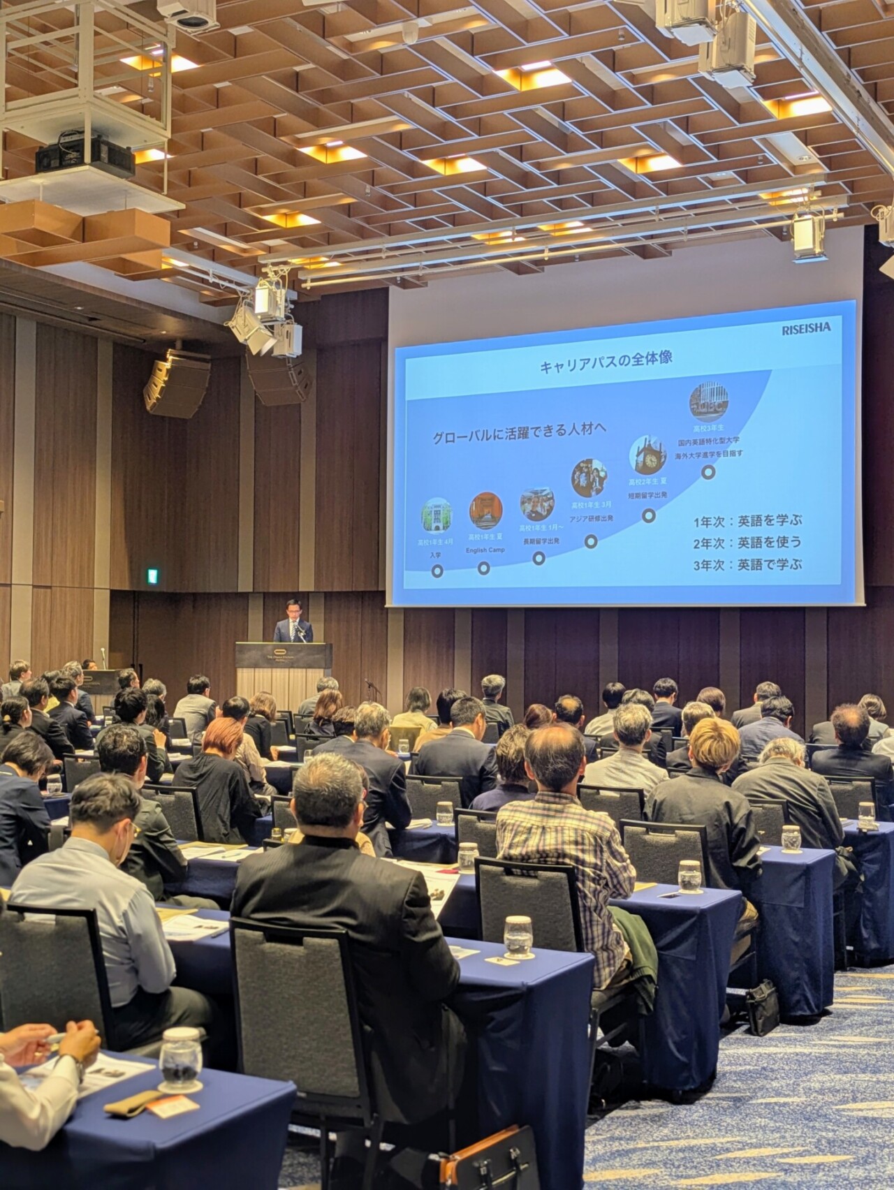 100名を超える参加者が耳を傾ける中、本校の篠岡校長の挨拶を皮切りに、全国学習塾協同組合理事の川東義武様による講演、法人国際部・藤原のコース概要説明と続きました。