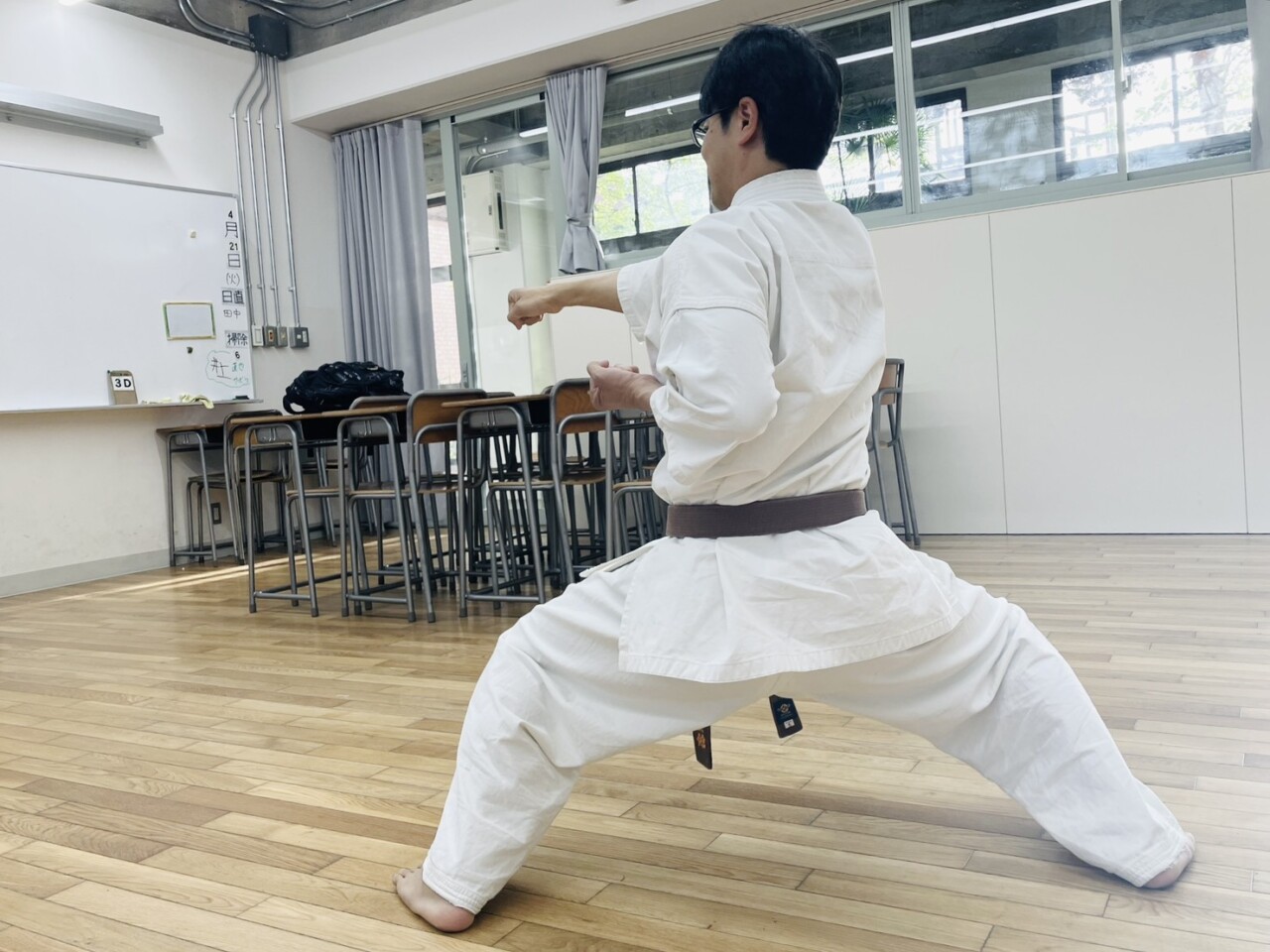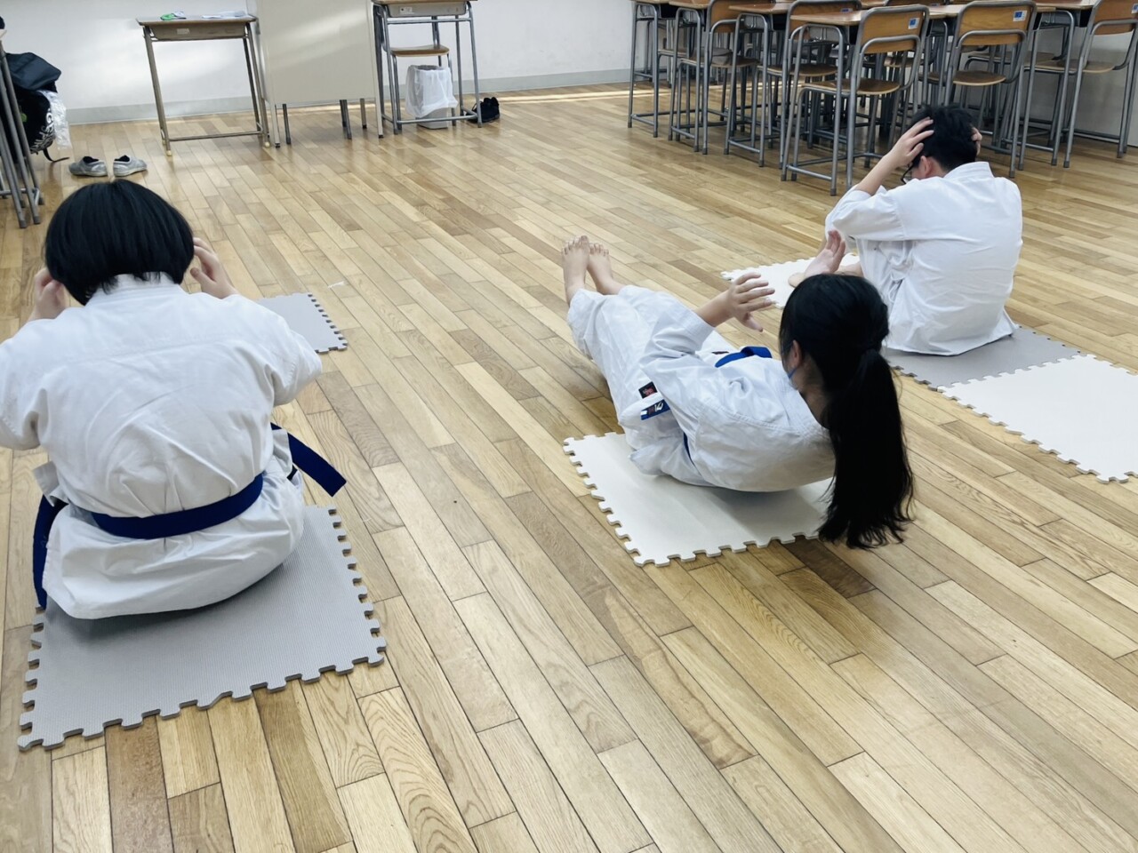 履正社中学空手部は、毎週火曜は顧問が担任する3年D組教室で、金曜は体育館の柔道場で活動しています。