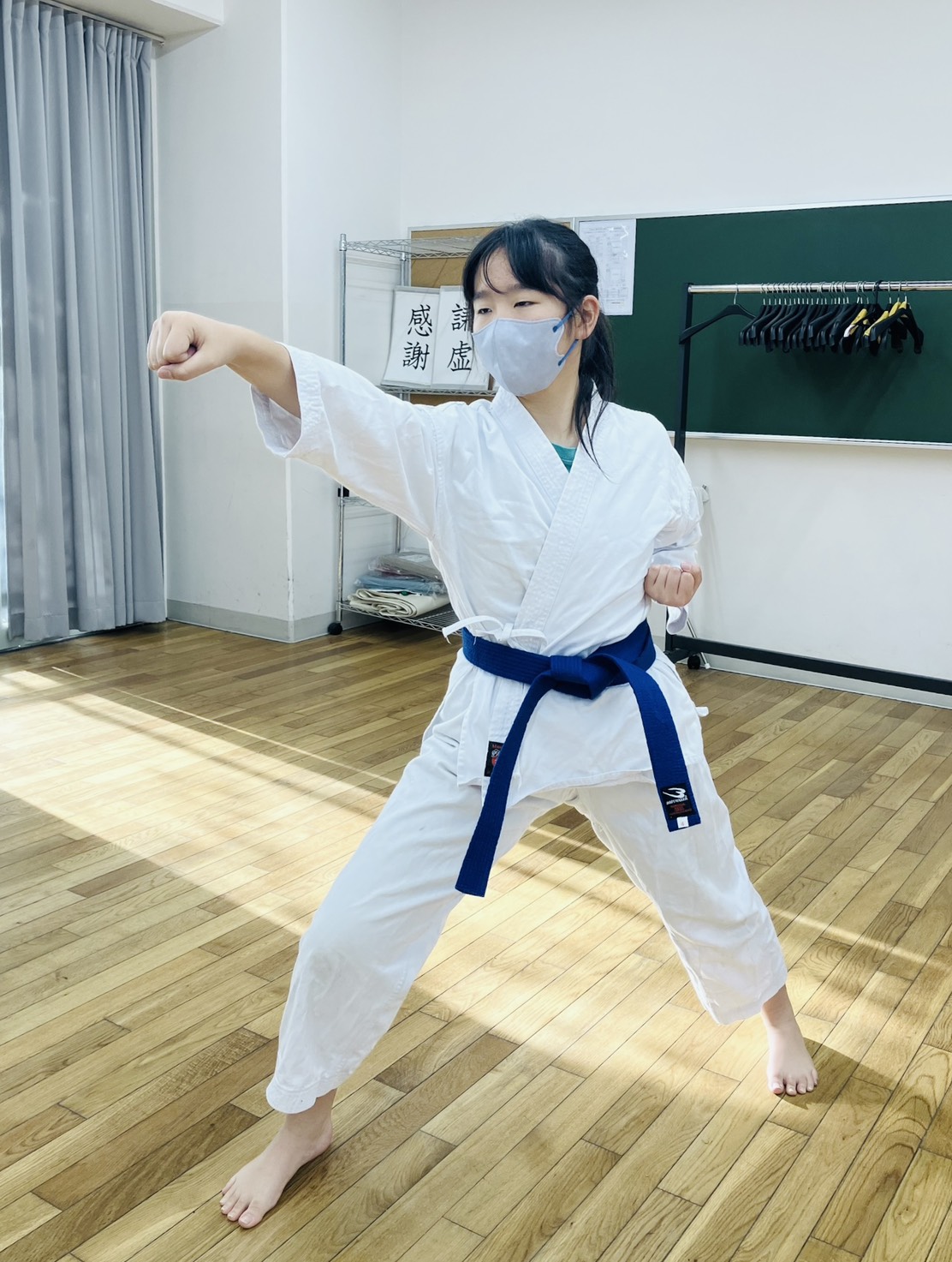 参加者3人が全員3年生だったので、今日は「突きの型」という少し難しい型を練習しました。型以外にも、ミットをしたり、組手をしたり、トレーニングルームを使って筋トレもします。