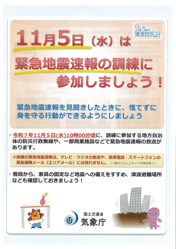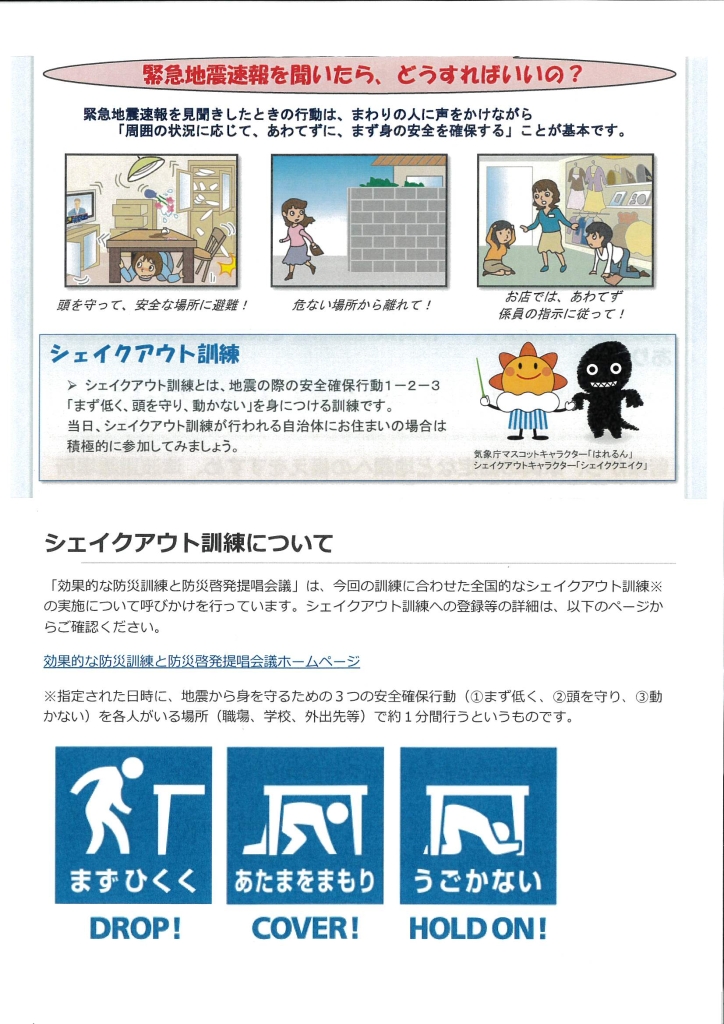 気象庁では、シェイクアウト訓練と言って地震の際の安全確保行動1-2―3「まずは低く、頭を守り、動かない」英語で言うと Drop! Cover ! Hold on!を奨励しているそうです。