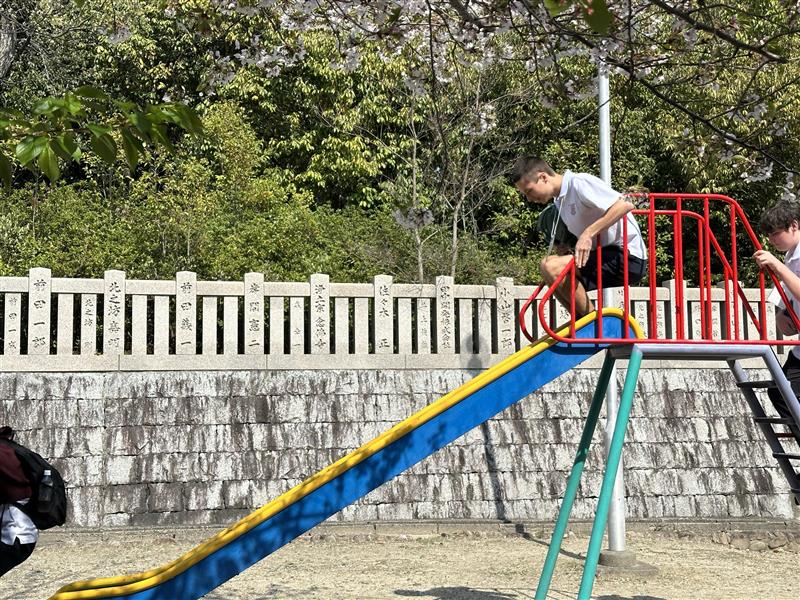 お昼の後は、履正社の近隣をお散歩します。目的地にしたのは、学校から徒歩で5分ほどの長興寺住吉神社とさらに10分ほど行った先にある、いくつかの古墳です。テプケ高校の皆さんは日本文化に興味を持ち日本語を学んでいる上、履正社での活動を終えた後は京都に行くことになっているため、すぐそばでリアルな日本の歴史を体験するツアーとしました。