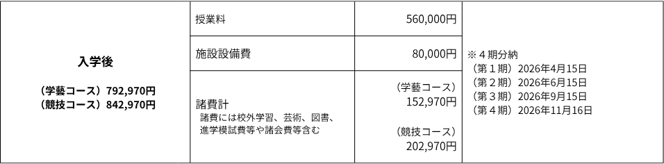 入学後の納入金は、年4回に分けて納入いただきます。2027年度の納入金額詳細は「入学者点呼」の際にご案内します。