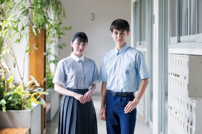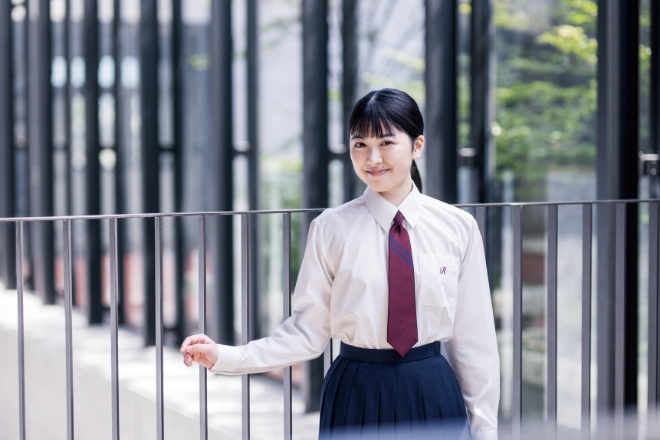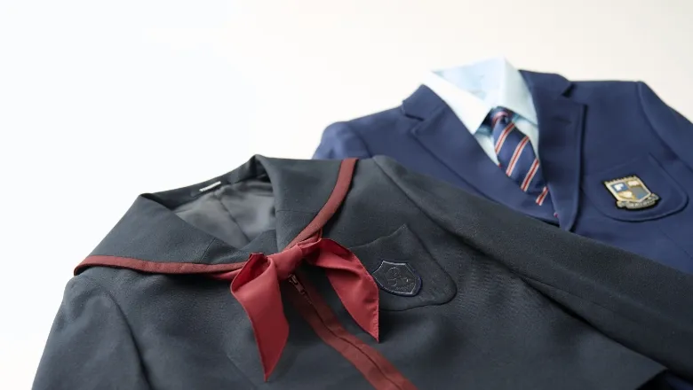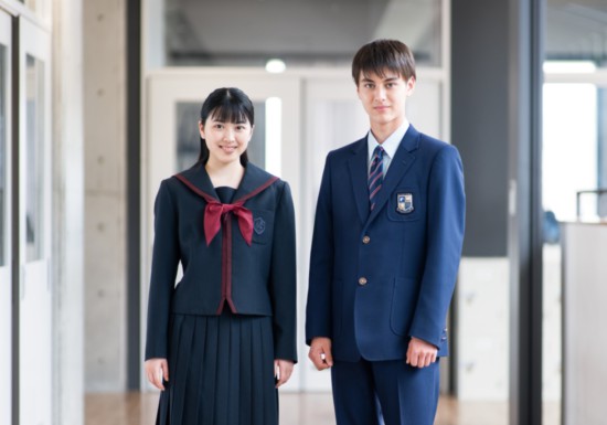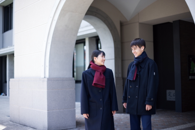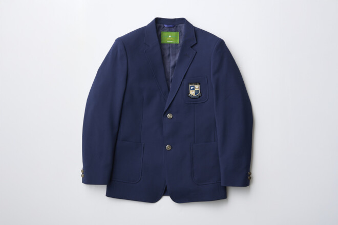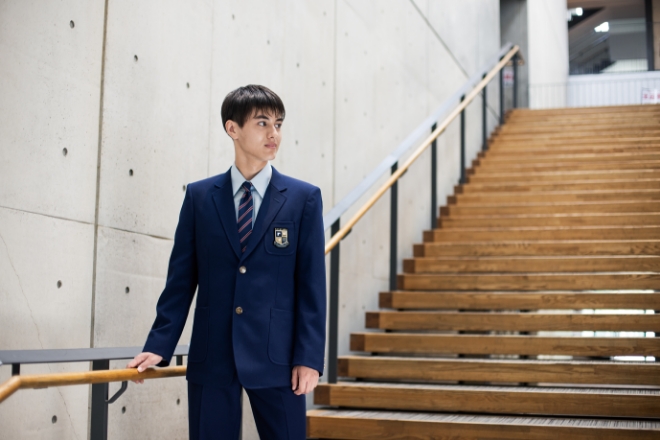 男子は胸にエンブレムを配したトラディショナルな紺のスーツスタイルで、知性と端正さを感じさせるデザインです。女子は本校の長い歴史と伝統を踏まえ、未来へと受け継がれる品格を表現した装いとなっています。