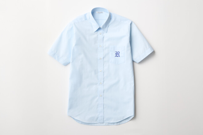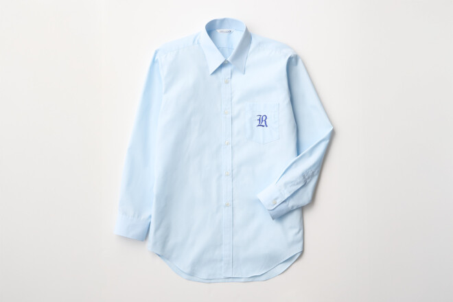 男子は胸にRの刺繍を施したブルーのシャツにスラックスを合わせ、清潔感のある装いです。女子は襟と袖口に白の切り替えを施したシャツブラウスとスカート、またはストライプ柄のワンピースから選択可能。爽やかさと上品さを兼ね備えたデザインです。
