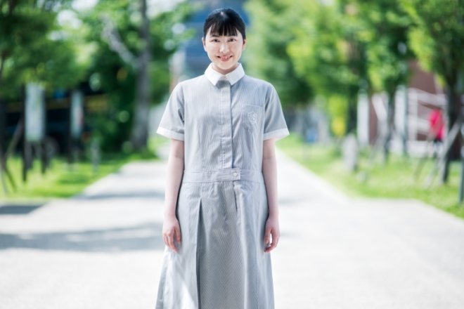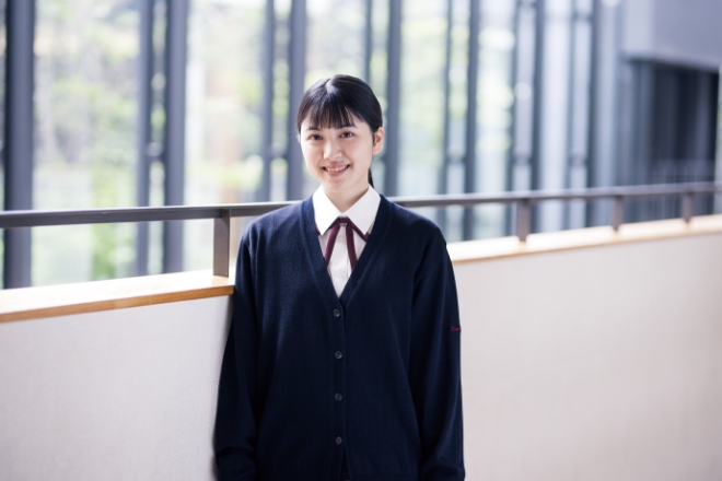 中学生・高校生らしい清潔感と、知性・伝統・品格を大切にしたコンセプトを体現する、クラシカルでありながら現代性も備えたデザインです。着こなしのバリエーションが豊富で、多彩な装いが楽しめます。女子制服は2000年の男女共学化に伴い制定され、生徒の体形に合わせて試作と検討を重ねることで、立体的で着心地のいい仕立てを実現しました。