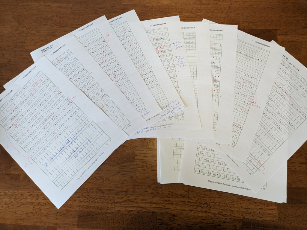 言語技術教育では、作文の添削が指導技術の主要な部分を占めています。有効な添削は生徒の記述力の向上につながります。教員たちは「再話」「意見型パラグラフ」「構造要約」「キーワード要約」「物語」「視点」「説明」「描写」「空間配列」「分析型パラグラフ」などのテーマごとに作文を的確に添削する手法を学ぶべく、この日は生徒になって積極的に質問を繰り返し、所長と対話を重ねながらワークに取り組みました。