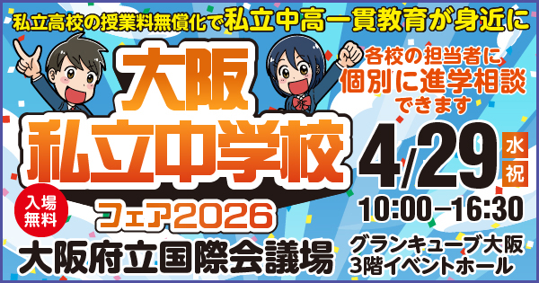 今月4月29日(水・祝)、グランキューブ大阪にて大阪の全ての私立中学校が参加する「大阪私立中学校フェア2026 (大阪私立中学校高等学校連合会主催)」 が開催されます。