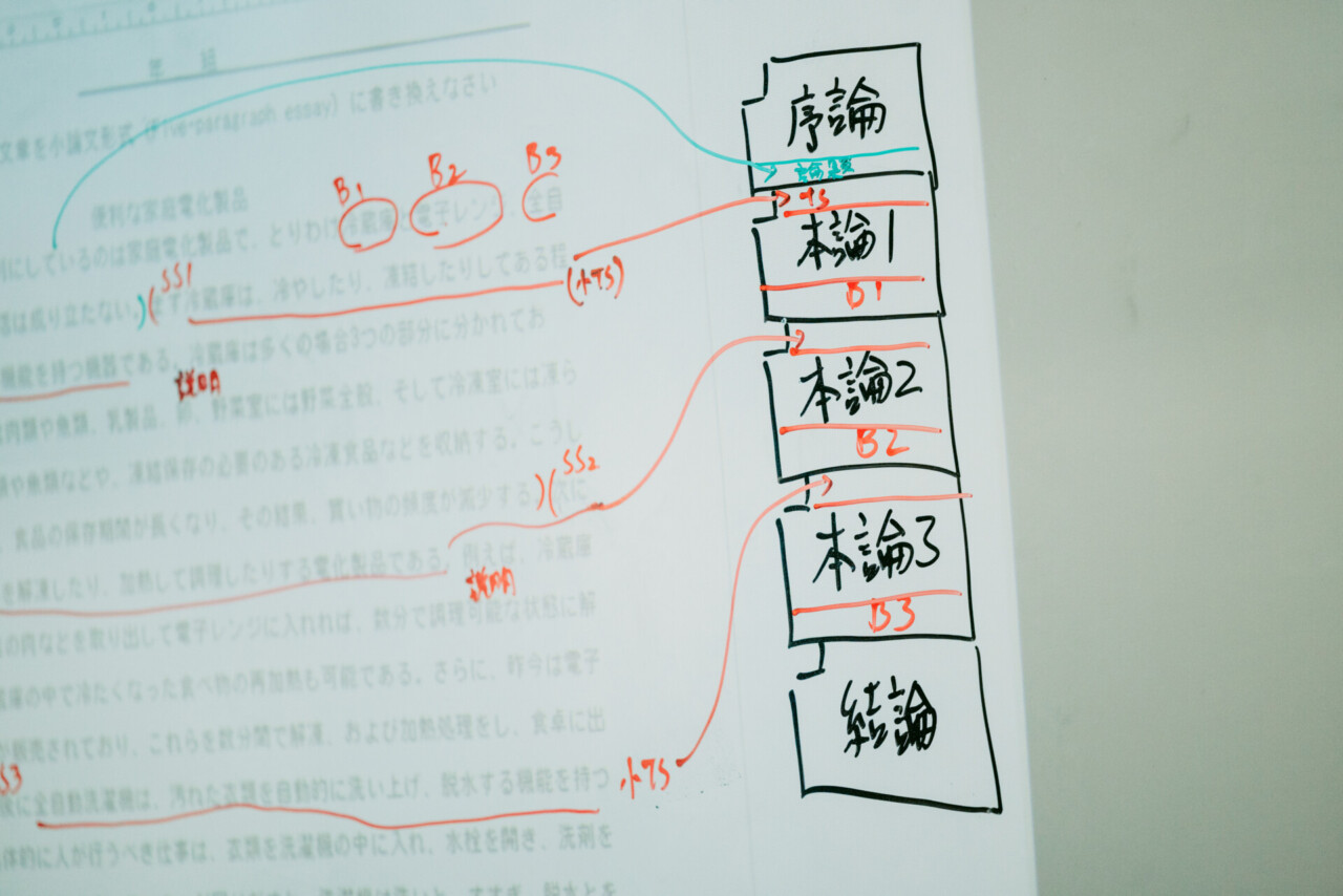 2つ目に身につけたい表現力とは、考えたことを口頭及び記述で、相手が理解できるように提供する力です。そのために「言語技術」の授業では、「問答ゲーム」と呼ぶ対話の基本練習を下敷きに、考えを口頭で即座に言語化して表現する訓練をします。またそれと並行して、口頭で述べた考えをパラグラフと呼ばれる型に則って文章化する方法を指導します。私達の最終目標は、型に則ったわかりやすい論文を記述できる能力を生徒に持たせることです。自分の考えを文章で表現する方法を学習するうちに、生徒の作文力が向上するばかりでなく、考え方にも変化が表れます。